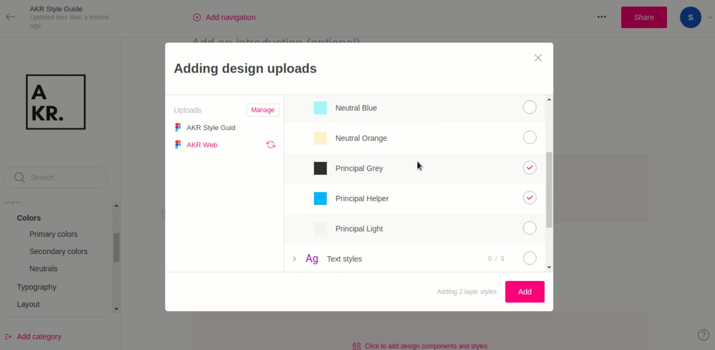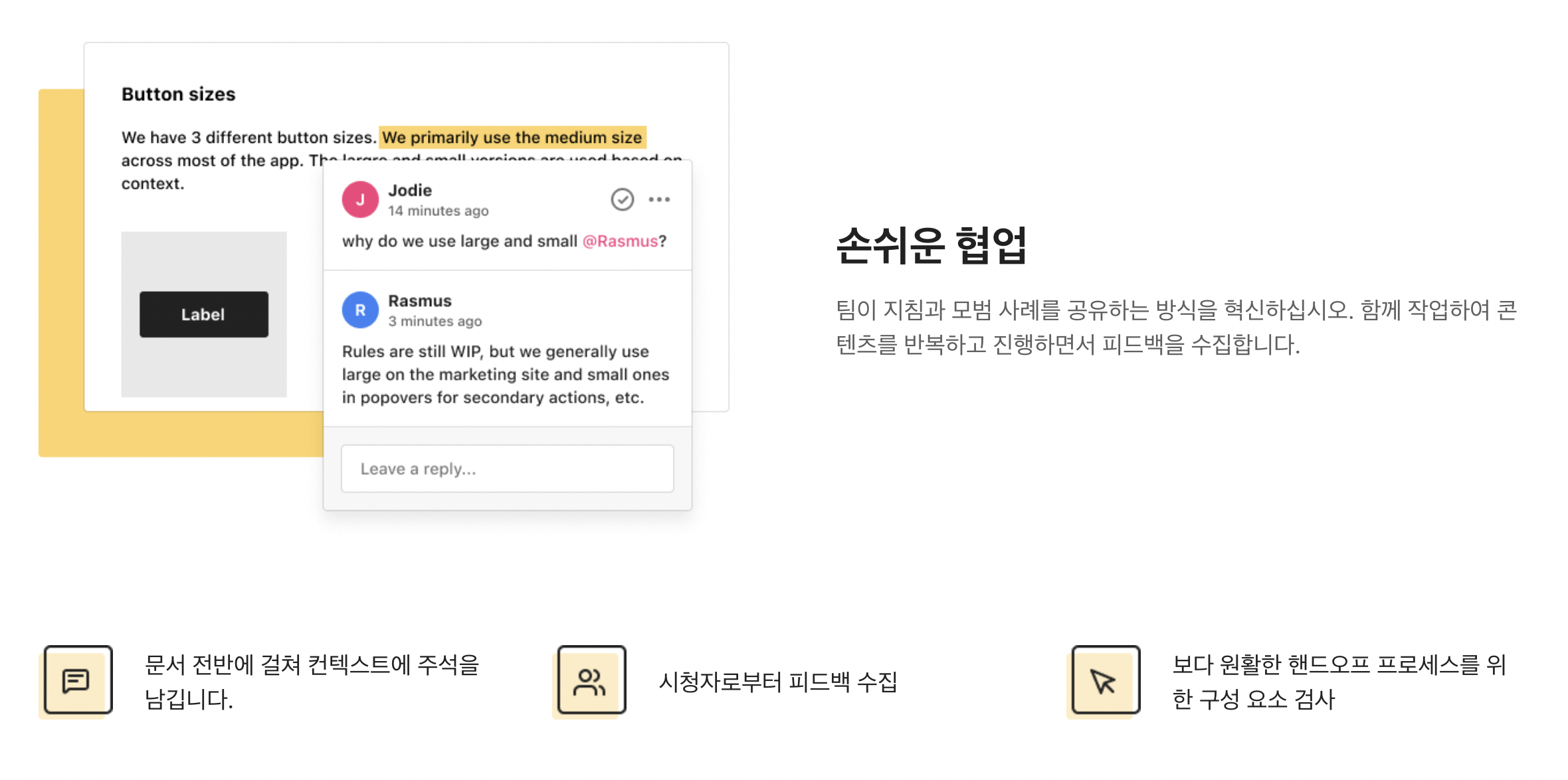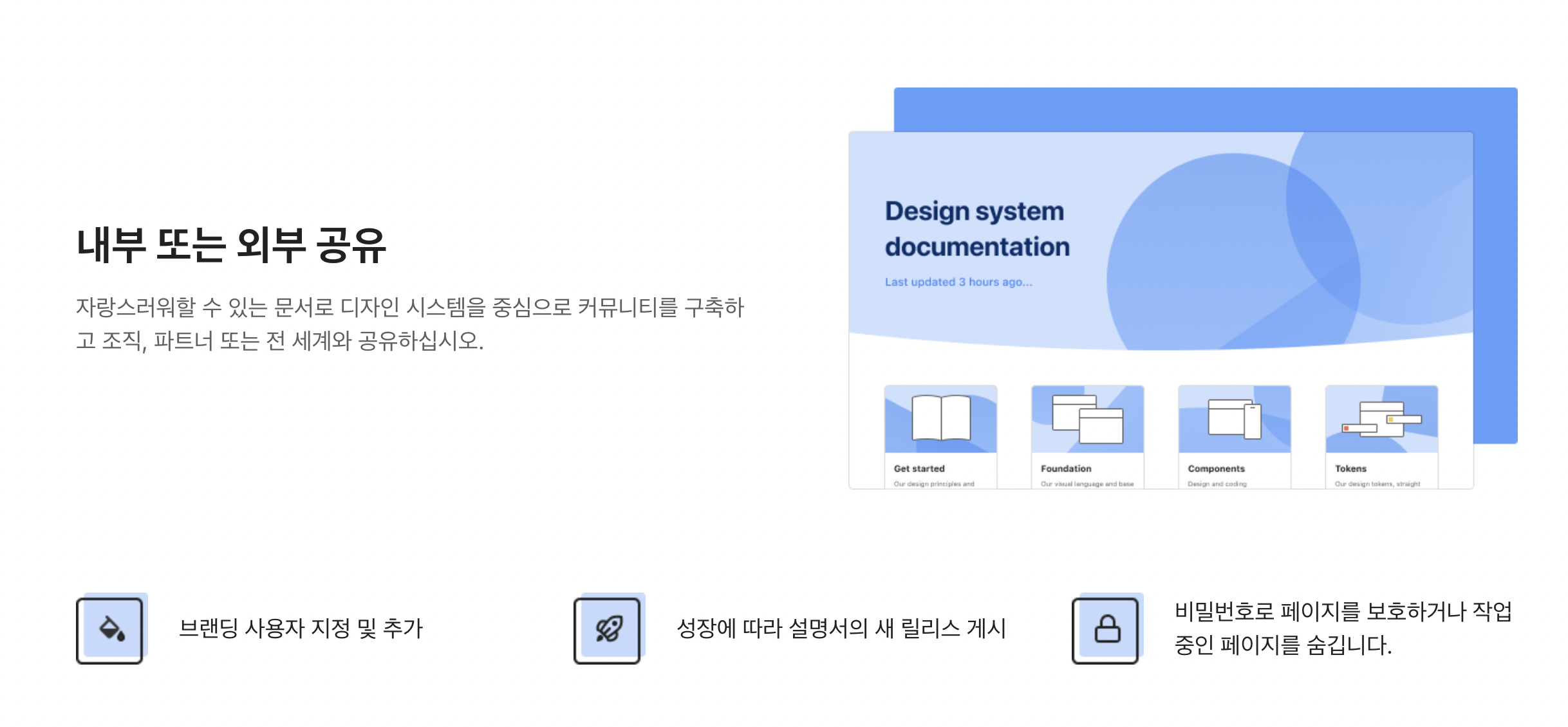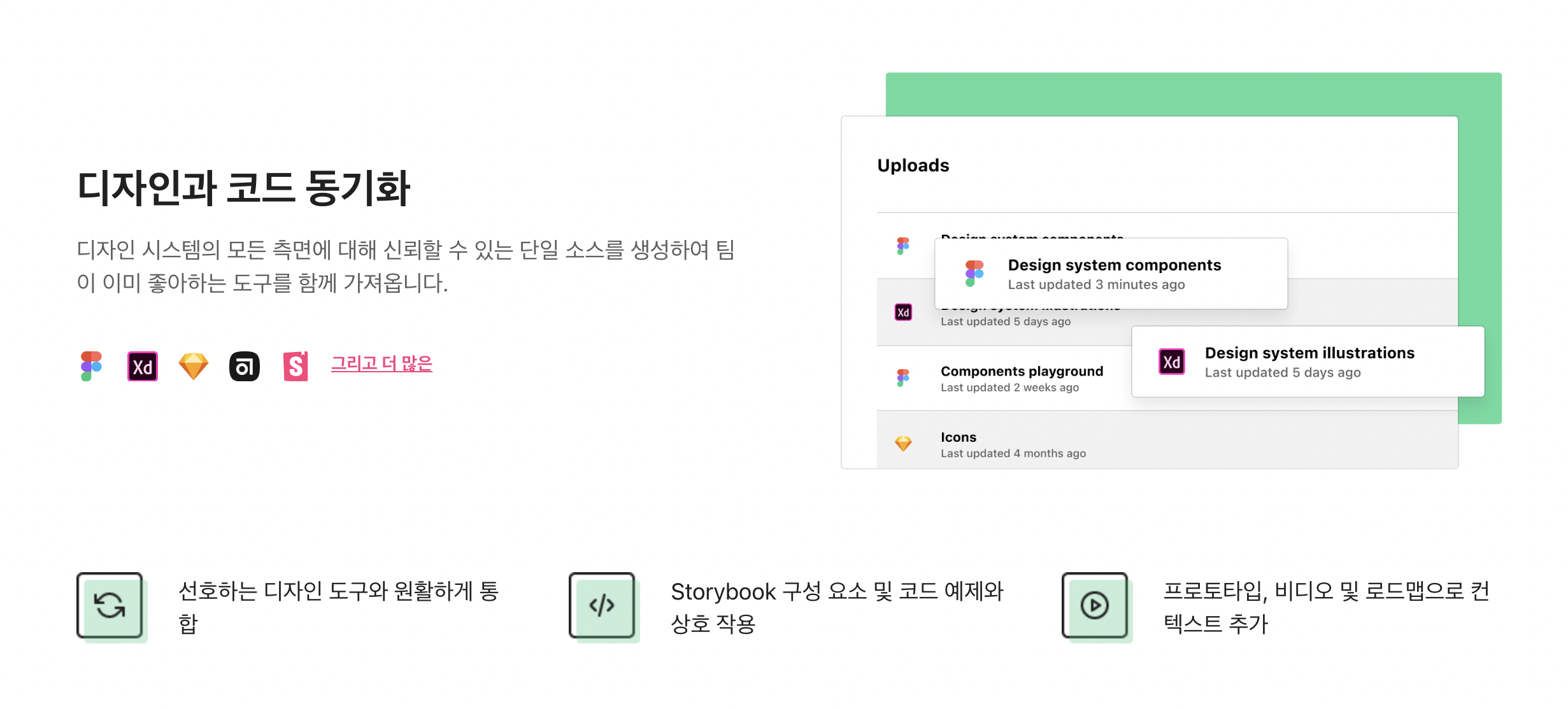 1. 피그마, 스케치, XD와 연동가능, 디자인 에셋을 불러오면 자동으로 디자인시스템에 추가된다.